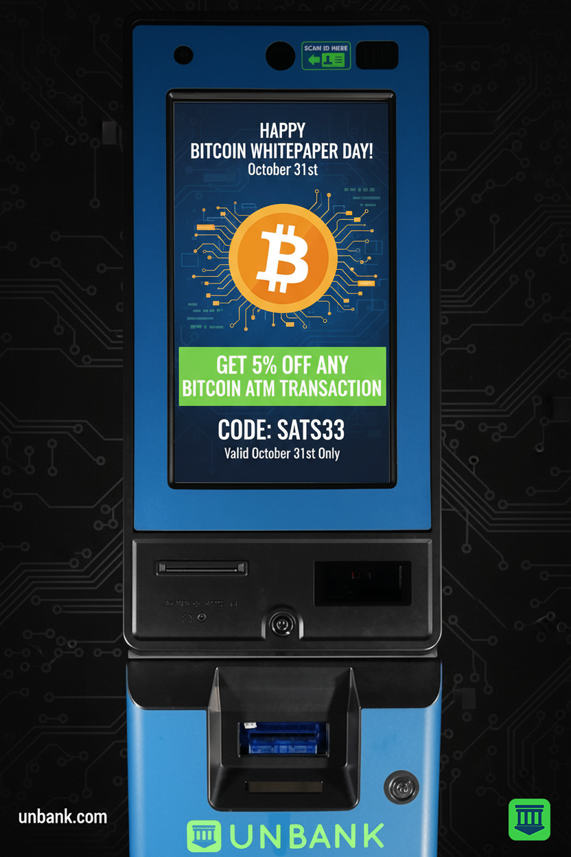 On this day in 2008, Satoshi Nakamoto introduced Bitcoin to the world, changing our lives forever. Celebrate this historic day with us by using code SATS33 for 5% off an Unbank Bitcoin ATM transaction! (Code valid today only) 📃