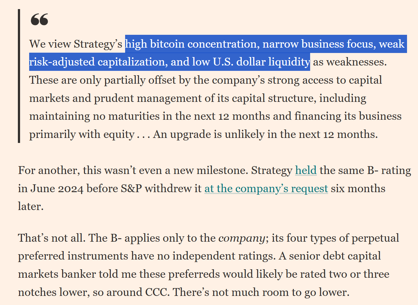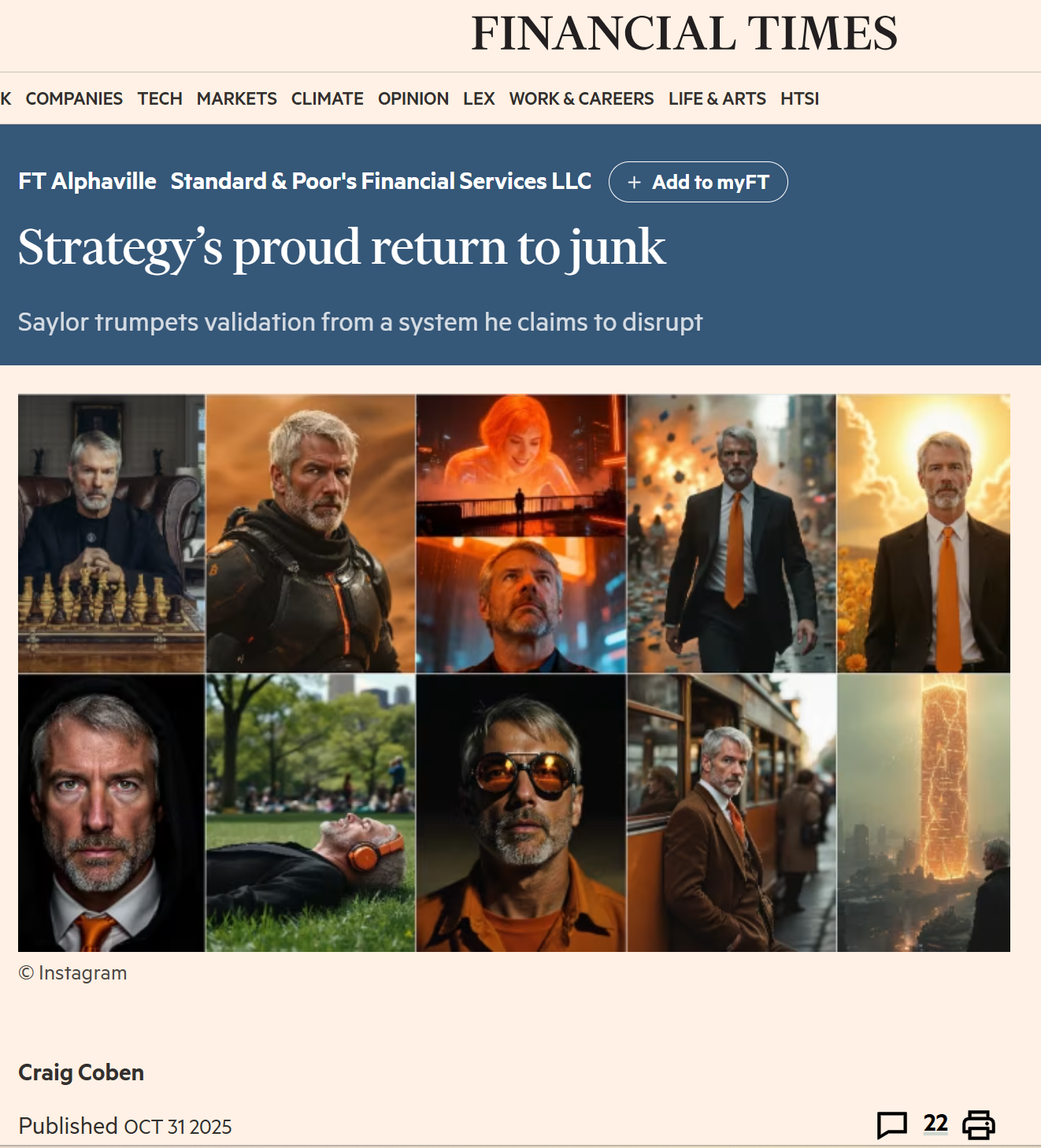 Strategy presents itself as a bulwark against the debasement of fiat currency. Yet it seeks legitimacy from two of the oldest and arguably most discredited pillars of the ancien régime: sell-side equity research analysts (FTAV has already dissected Citigroup’s initiation report) and credit rating agencies