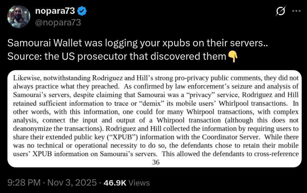 The prosecution herein refers to a main point of criticism of Samourai Wallet's design by competitors and privacy advocates, in which users who did not run their own node provided their extended public key (XPub) to Samourai Wallet's coordinator, allowing the developers to cross-reference transactions.