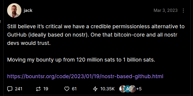 Once upon a time (March, 2023), Jack was offering a 10btc bounty for github on nostr.