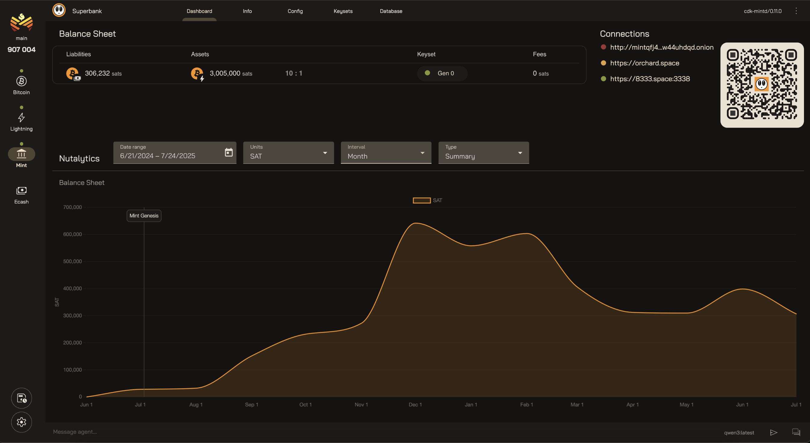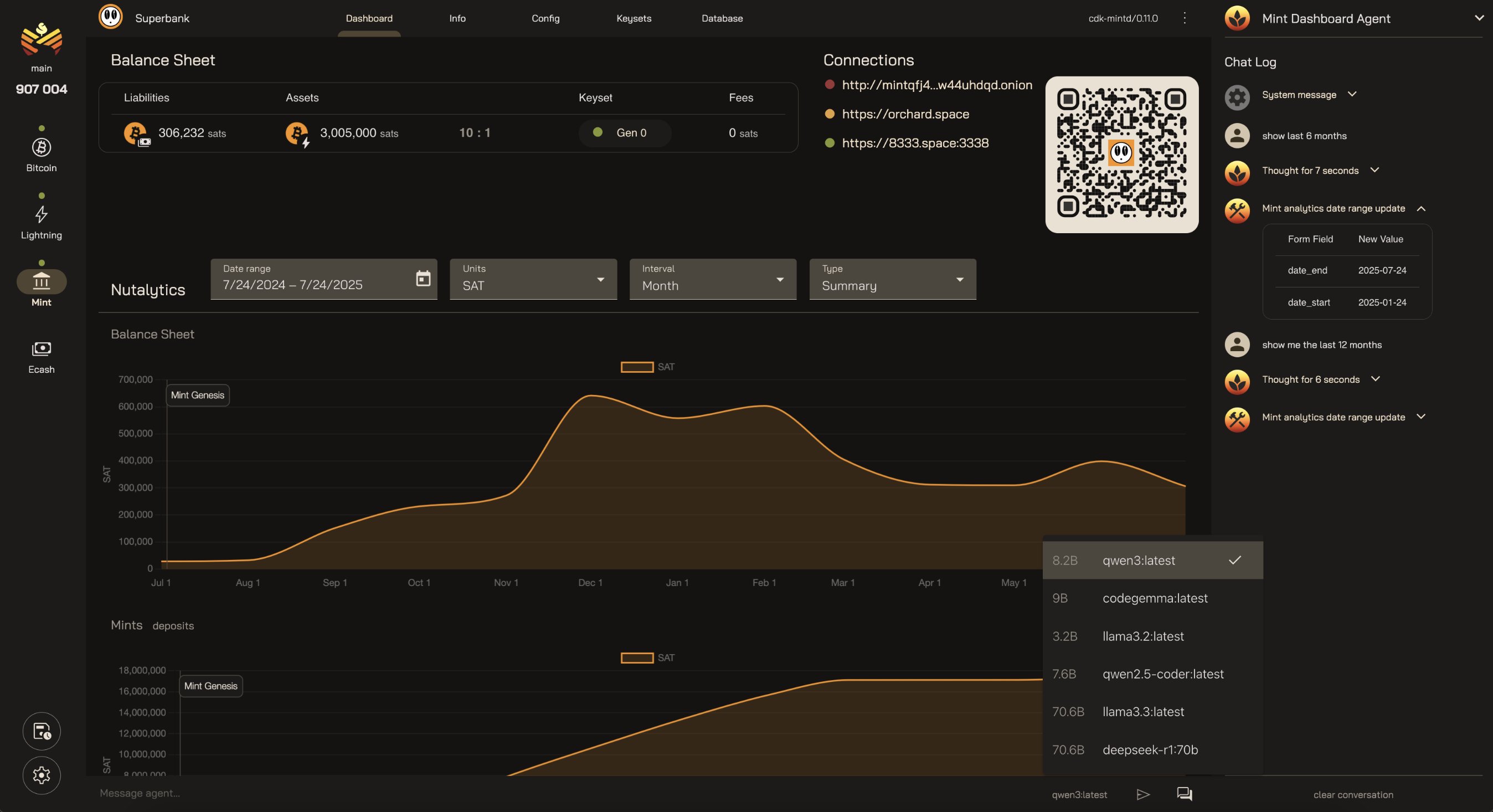 All integrations are optional, including the ai integration where a local ollama instance can be plugged in to explore data or manage the mint with chat controls