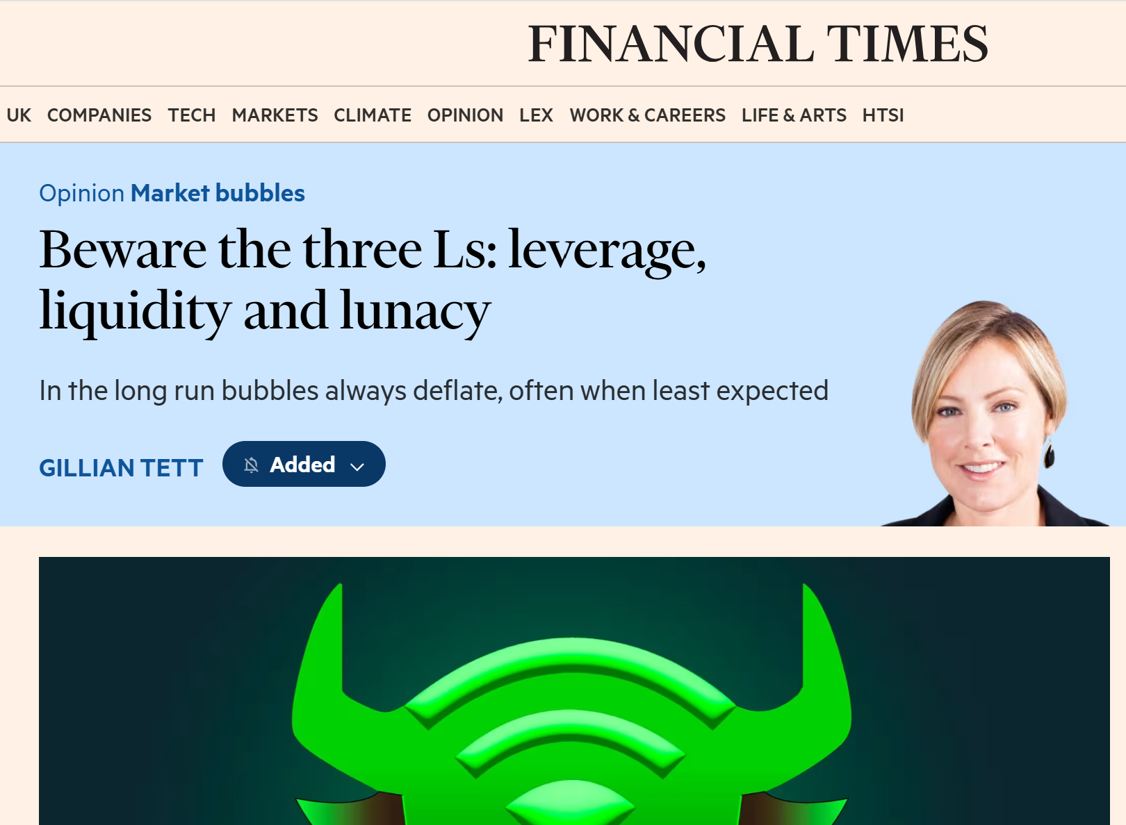 in the long run bubbles do always deflate, often when least expected. In public markets this can be a sudden “pop”; in private finance (which matters now), it is more often a long, slow “hiss”. Either way, keep watching leverage and liquidity, and remember that some lunacies often only become clear in hindsight — just as in 1929.