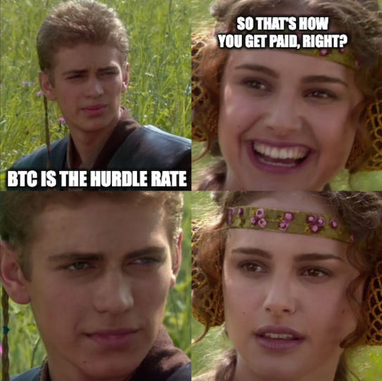 The fact that few—if any—of the management teams and boards whose filings we reviewed have chosen to hold themselves to the gold standard of BTCTC governance perhaps reveals something telling about their “corporate soul”: their true beliefs, priorities, and “revealed preferences.” For all their sanctimonious invocations of the Bitcoin Standard ethos, they appear to be at least as “fiat-brained” and “high time preference” as anyone else in our Golden Age of Grift.Never forget that as a BTCTC shareholder you only win when your shares appreciate faster than Bitcoin itself. If insiders have ever received or will ever receive compensation tied to any outcome other than this—or if they’re compensated over a shorter time horizon than the holding period they recommend to you—then they are fundamentally playing a different game than you are.