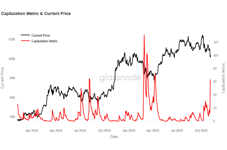 The capitulation metric represents a quantitative reading of the extreme emotional and financial behavior of investors during periods of sharp market decline. Its rationale is based on the idea that major reversal points, local or global bottoms, occur when sellers are completely exhausted, that is, when the weakest participants succumb to fear and sell their assets at a significant loss.