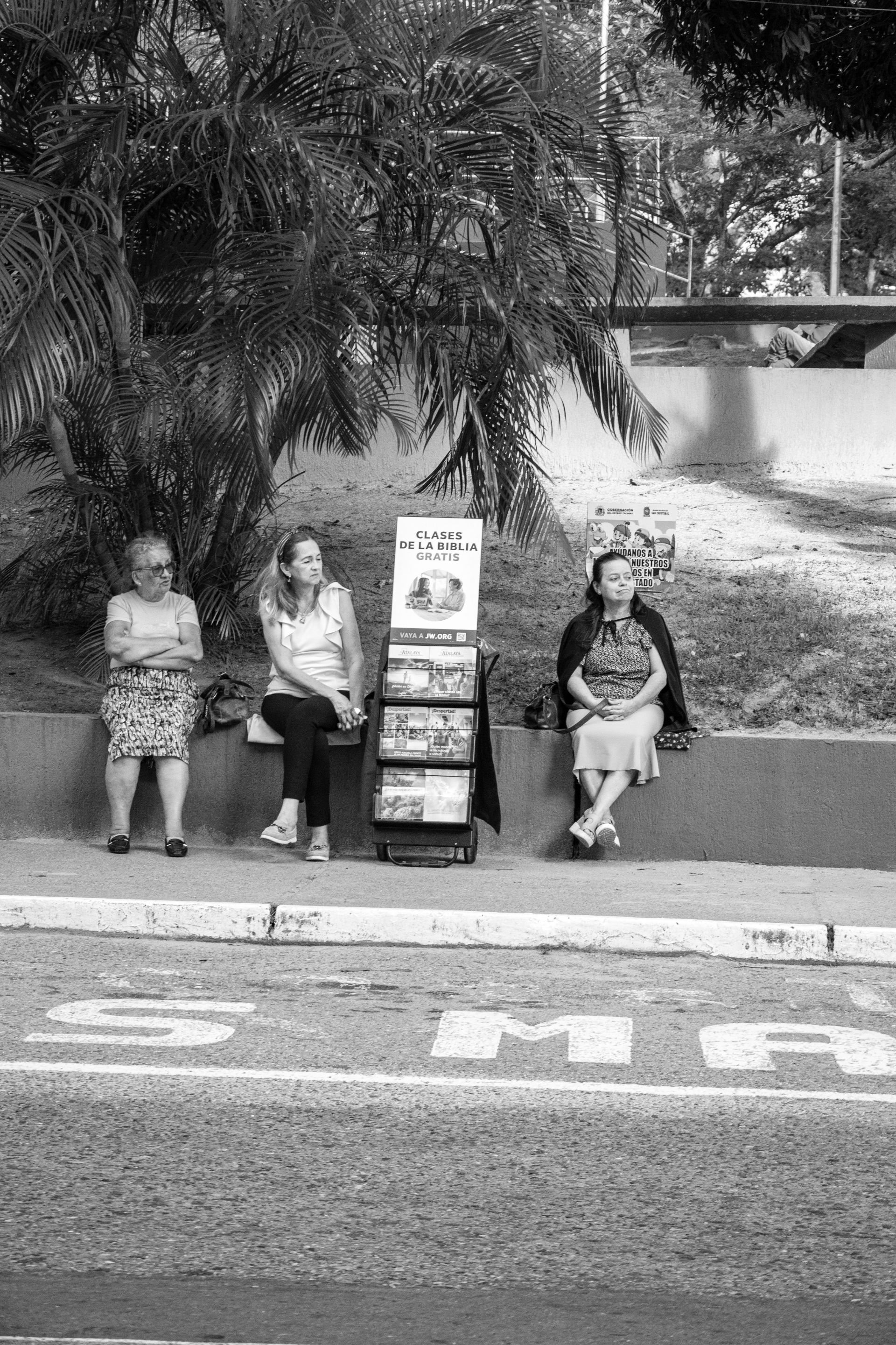 Some ladies sitting on the side. The sign says "Free Bible Classes":