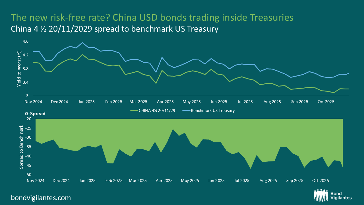 On 5th November China issued $4 billion worth of US dollar (USD)-denominated bonds split across two equal tranches. The orderbook was $161 billion at one point, but ended near $118 billion when final pricing was announced. The 3-year $2 billion tranche priced at US Treasury + 0bp (aka flat to UST) and the 5-year $2 billion tranche priced at US Treasury +2bp. The following morning, bonds traded up significantly and were quoted more than 30bp inside UST (specifically: China 28s -33.5bp | China 30s -37.5bp).This is unusual. Looking at other high-credit quality sovereign issuers in US Dollar, South Korea 30s (AA-rated) trade at T+5bp, Abu Dhabi 30s (AA-rated) trade at T+10bp, or Qatar 30s (AA-rated) trade T+18bp. China is A+ rated so, on paper, its creditworthiness is assessed as weaker than South Korea or Qatar, and in this case AA-rated USA. So, what’s so special about China? “Has it become the new risk-free rate” asked one of my colleagues?[...]