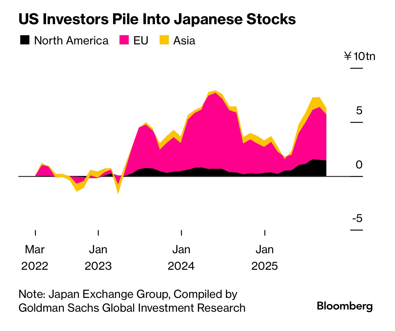 US investors are increasing their exposure to Japanese stocks, especially in tech and AI.