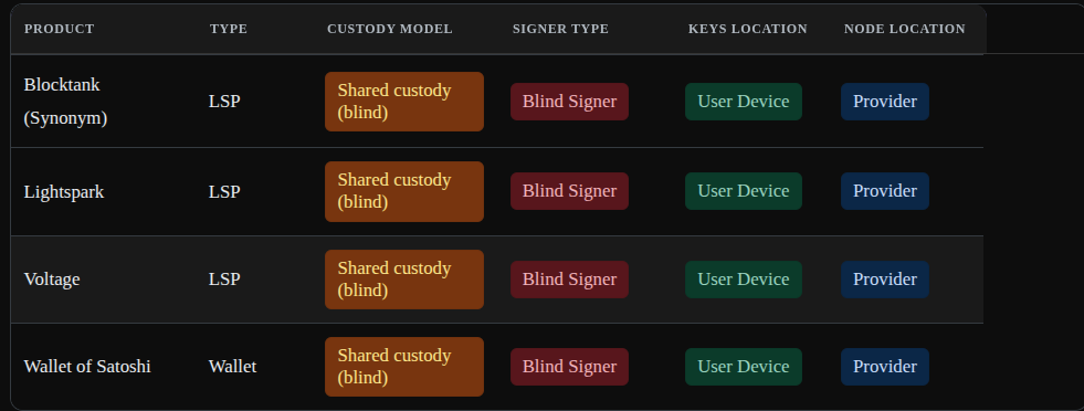 For Synonym, AFAICT, while Bitkit is a mobile LND hot wallet, the Blocktank LSP seems to be a blind signer. From their website : "Instant Bitcoin transactions require a Lightning connection. Blocktank provides you with a self-custodial, stable, and seamless experience, while eliminating the complexity of managing a node."