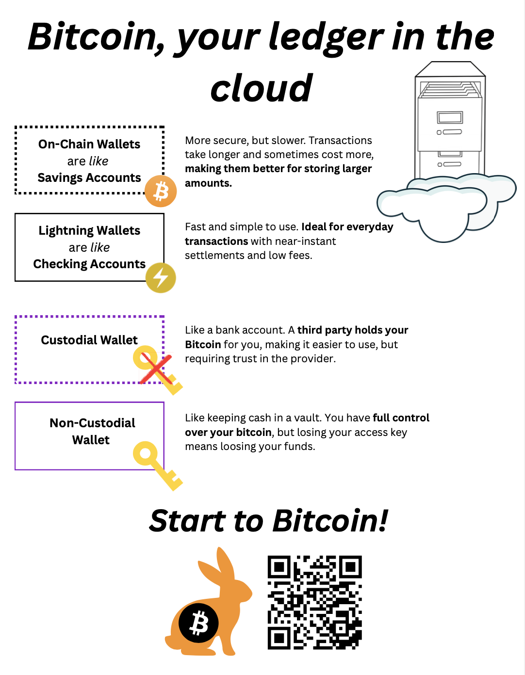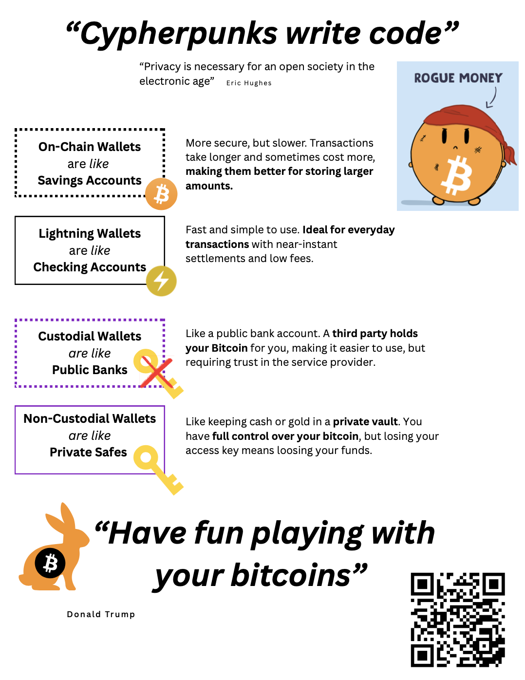 The handout must have a basic description of bitcoin, basics about bitcoin wallets (custodial and self custodial), lightning, and on-chain. Also an open-source github repository of the handout, for later translations from English. The handout should be easily printable from PDF format.