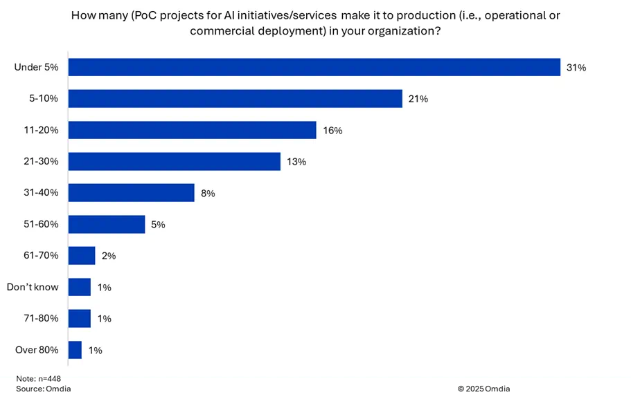The efficiency and value of AI Proof of Concept (PoCs) projects and pilots are the subject of heated debate, fuelled by reports claiming that only a handful make it to production. This has been interpreted as proof that generative AI is failing to scale, that stalled PoCs mean AI cannot deliver against investment drivers, and worse still, that we are heading for an AI bubble. However, Omdia's 2025 AI Market Maturity Survey* reveals a more nuanced, balanced prognosis for AI POCs, and what this means for AI.Omdia's survey reveals enterprises are actively engaged with AI PoCs. Most are drawn to conservative to moderate experimentation, with 40% running 6-20 PoCs, while 18% operate 21-50 PoCs, showing broader AI commitment across multiple use cases. Only 4% of enterprises run over 100 PoCs, with the most intense activity at this level dominated by the largest companies in the survey. This is not surprising, as PoCs at this scale are resource-intensive and expensive, and even more so for pilots. Twenty-one percent of enterprises in the survey run fewer than 5 PoCs, which could reflect early-stage adoption or lack of resources. It is notable that 43% of firms in the survey with revenues below $100 million are running fewer than 5 PoCs.[...]