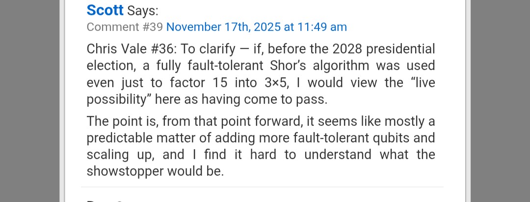 given the current staggering rate of hardware progress, I now think it’s a live possibility that we’ll have a fault-tolerant quantum computer running Shor’s algorithm before the next US presidential election.