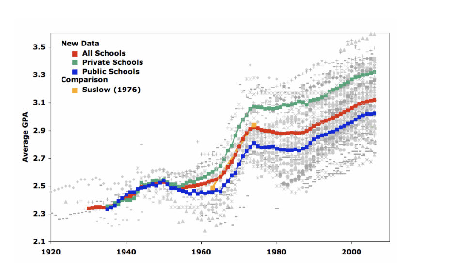 My second thought was: nowadays the bigger reputation signal of a university's quality is how selective they are in admissions, and not what they actually teach the students. There's data showing that over this time period, average SAT scores became much more correlated with ranking, suggesting that students are more and more sorted by talent at the entry point. If university reputation is based on selectivity up front, then grades out the door matter less. The increase in selectivity is likely due to the increasingly national/global nature of universities, as well as the increase in demand for them.