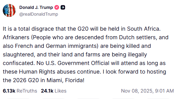 His guest, South Africa's President Cyril Ramaphosa, sat in awkward silence beside him, refusing to be drawn into the Trump show. Ramaphosa flatly rejects the fringe theories which are being amplified by Trump supporters including South African-born billionaire Elon Musk also standing in the room.