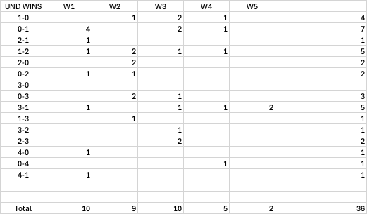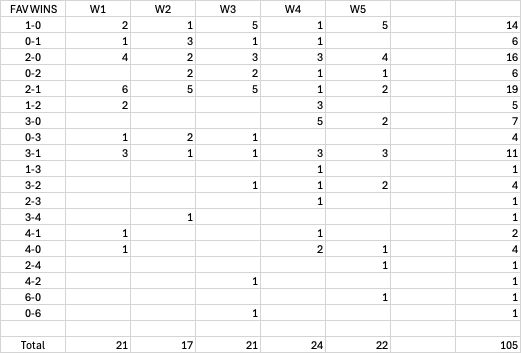 A different picture appears when the underdogs win. 0-1 is the commonest result with almost 20% of final scores. Then, 1-2 and 3-1 follow with a 13.88% each. On aggregate, combination of 0-1 and 1-0 count up to a 30.55% of total scores. 2-1 plus 1-2 combined only reach a 16.66% of final scores.