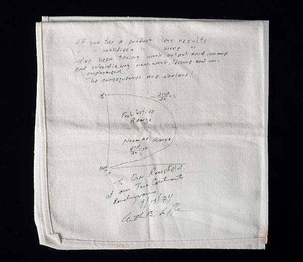 In 1974 economist Art Laffer sketched a new direction for the Republican Party on this napkin. Displeased with President Gerald Ford’s decision to raise taxes to control inflation, four men got together at a Washington, DC restaurant to think about alternatives. Laffer was joined by journalist Jude Wanniski and politicians Dick Cheney and Don Rumsfeld. Laffer argued that lowering taxes would increase economic activity. Wanniski popularized the theory, and politicians Don Rumsfeld and Dick Cheney carried it out.
