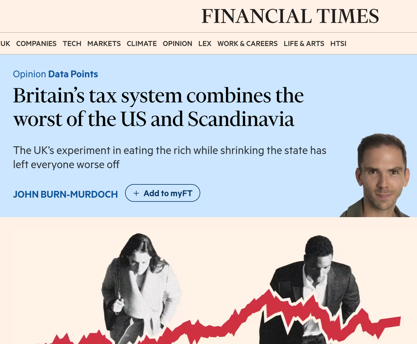 Scandis tax their populations a lot, it's true, but the proceeds are mostly recycled value to the same individuals across their lifespans. Britain doesn't as much; it just, sort of, squanders the stolen goods, achieving neither the free market paradise envisioned by, well, free marketeers, nor the socialist welfare utopia by the left. (years ago I wrote a short thing about this: https://authory.com/JoakimBook/win-the-Nordic-model-for-the-UK-ad99b9a6f92b44feabe512af6add440f5)