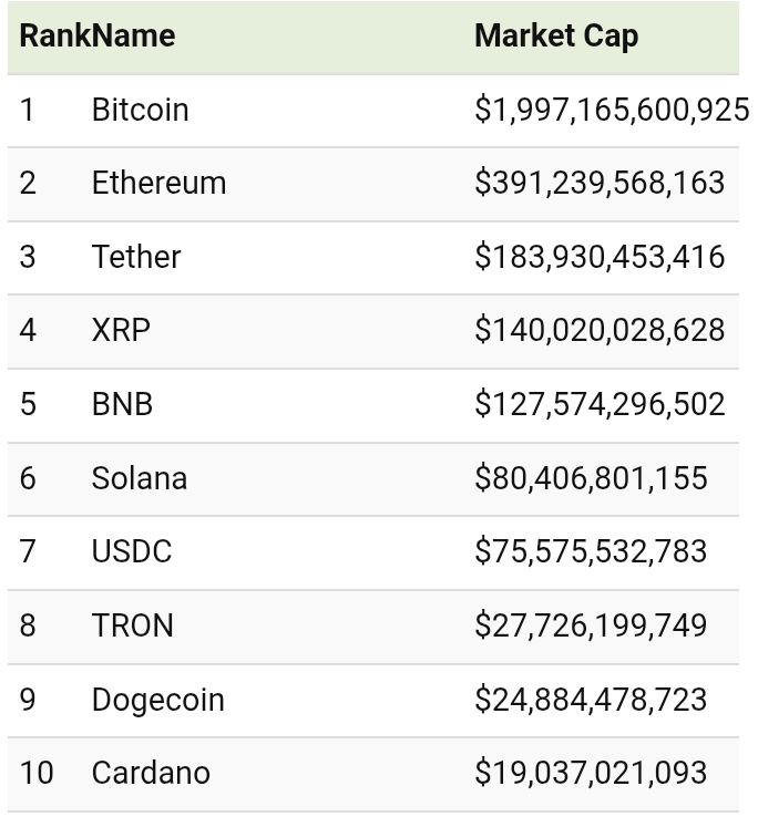 Bitcoin remains the world’s largest cryptocurrency, nearing a $2 trillion market cap in 2025. Stablecoins like Tether and USDC now occupy significant positions in the market. Data