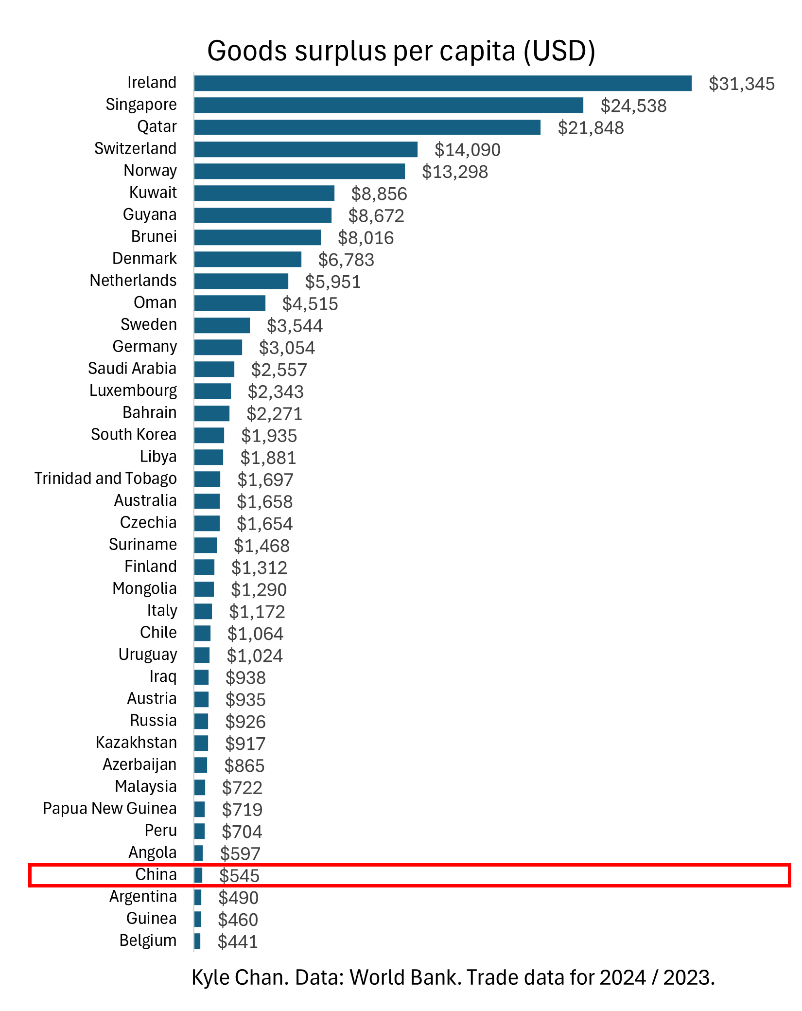 One key fact missing from this FT piece implying China exports too much and imports too little: China’s per capita trade surplus ranks only 37th globally.