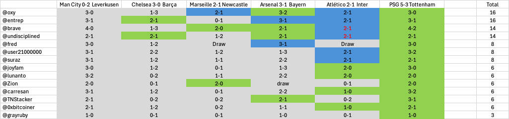 Second half had a better outcome. PSG win over Tottenham was predicted by all of us, though none guessed that the final score included 8 goals. Atletico beat Inter 2-1, when everything looked like it was going to end up in a draw. Arsenal beat Bayern 3-1.