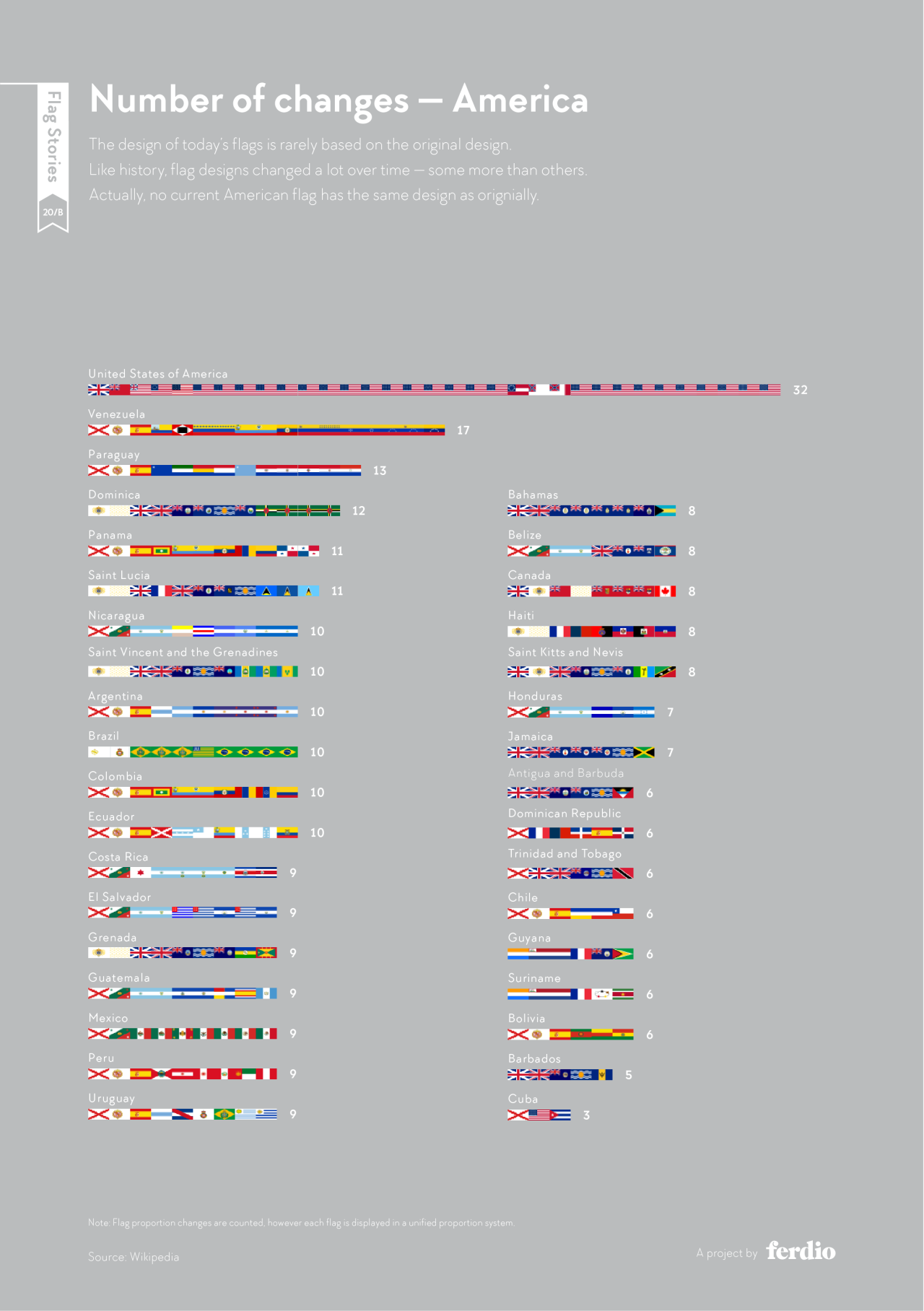 Basically we started looking at all the flags in the world and squeezed all the data we could possibly gather in to a blank spreadsheet. The more we dug into it, the more stories we managed to reveal, so our plan is to keep digging and continuously adding new stories to the project. Wikipedia has been our most used source for information, but you will find the specific source list for each visual at the bottom of the page. We have included flags of the UN member states.