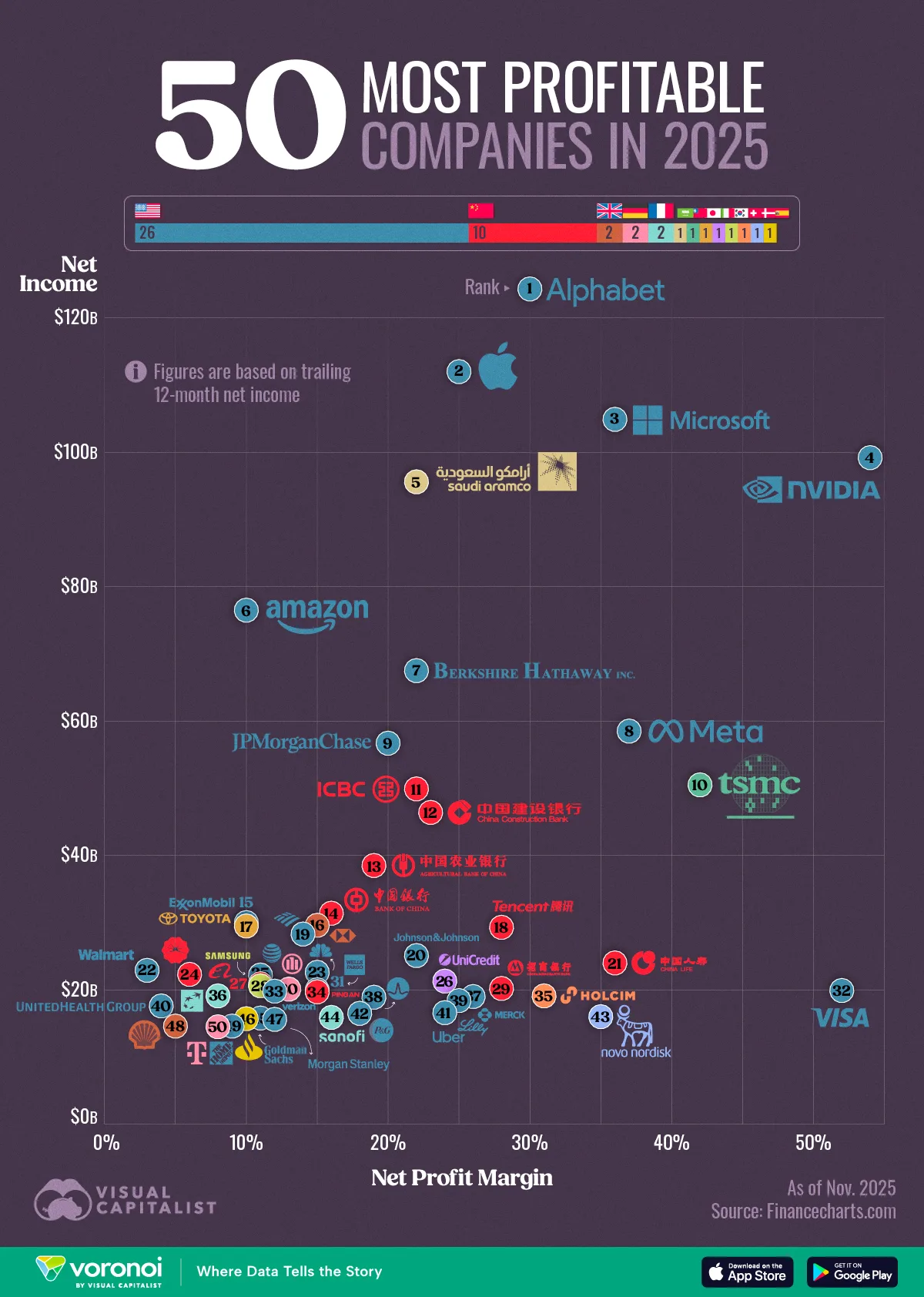 The ranking of the world’s most profitable companies in 2025 highlights a powerful concentration of earnings across technology, finance, and energy.The data for this visualization comes from FinanceCharts.com. It ranks companies by trailing 12-month net income as of November 2025 and shows the profit margins behind those earnings.