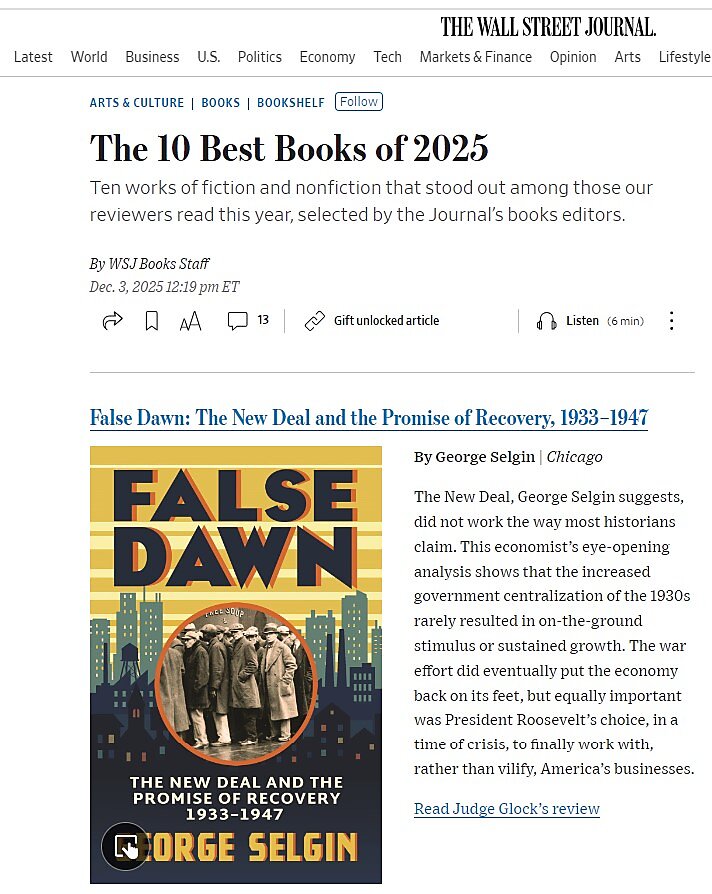 False Dawn: The New Deal and the Promise of Recovery, 1933–1947, by former Cato Senior Fellow George Selgin, was ranked among the “10 Best Books of 2025” by The Wall Street Journal this week. Selgin, also the director emeritus of the Center for Monetary and Financial Alternatives at the Cato Institute and professor emeritus of economics at the University of Georgia, retired this year.The ten best books of fiction and nonfiction from 2025 were selected by the Journal’s book editors. For False Dawn, the Journal wrote,“The New Deal, George Selgin suggests, did not work the way most historians claim. This economist’s eye-opening analysis shows that the increased government centralization of the 1930s rarely resulted in on-the-ground stimulus or sustained growth. The war effort did eventually put the economy back on its feet, but equally important was President Roosevelt’s choice, in a time of crisis, to finally work with, rather than vilify, America’s businesses.”
