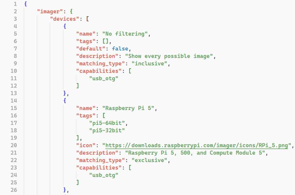 Are you an image vendor or a hobbyist looking to distribute your own custom Raspberry Pi OS image through Raspberry Pi Imager? If yes, then this guide is for you. In this post, we’ll take a deep, technical look at how Raspberry Pi Imager discovers and lists operating system images, and how the repository JSON format works under the hood.With the release of Raspberry Pi Imager 2.0, a number of improvements have been made to the user interface, the imaging process, and internal configuration handling (for more details, see the Raspberry Pi Imager 2.0 announcement post). One of the more interesting changes is the updated JSON schema used to define available OS images. This update is particularly relevant to the introduction of cloud-init support in Raspberry Pi OS, including a new cc_raspberry_pi module that enables configuration features like enabling SPI automatically.