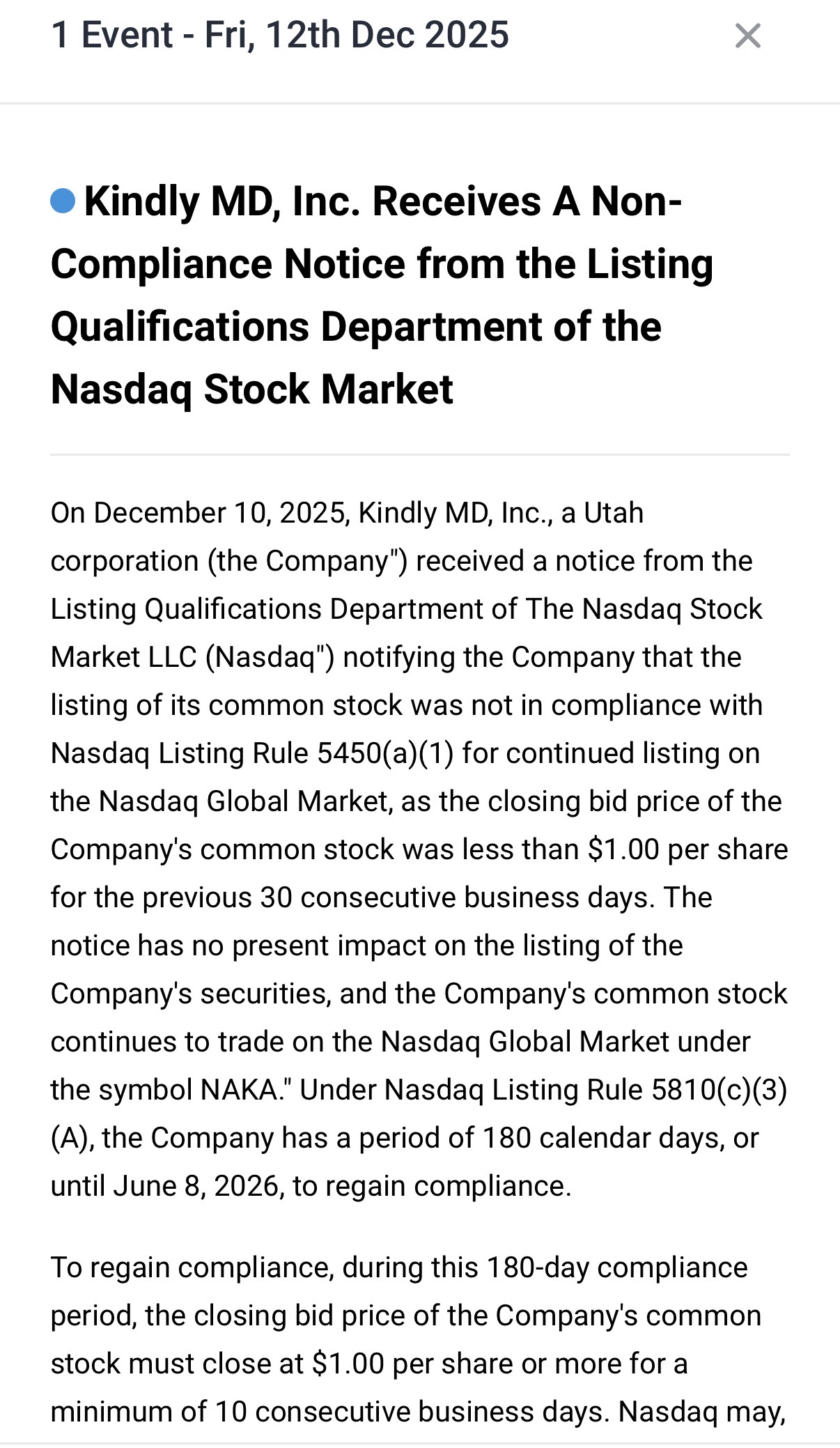 Yikes NAKA might be nuked off the NASDAQ if they don’t get that stock price above 1 cuck buck! They got 180 days to get back into compliance