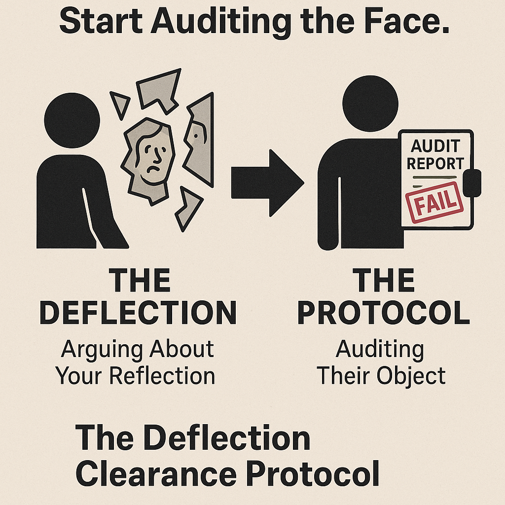 Your assignment this week: Identify one deflection pattern in your life. Apply the protocol. Do not follow their redirect. Report the evidence of the failure of duty. Notice what happens when you stop arguing about the reflection and start auditing the object.