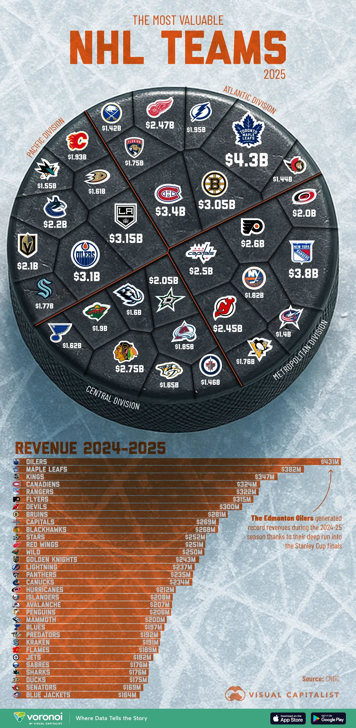 CNBC’s latest valuations for 2025 show that historic NHL franchises still command the highest price tags, but fast-growing teams in non-traditional markets are beginning to close the gap.This visualization ranks all 32 NHL teams by their estimated enterprise value, alongside their revenues from the 2024–25 season.