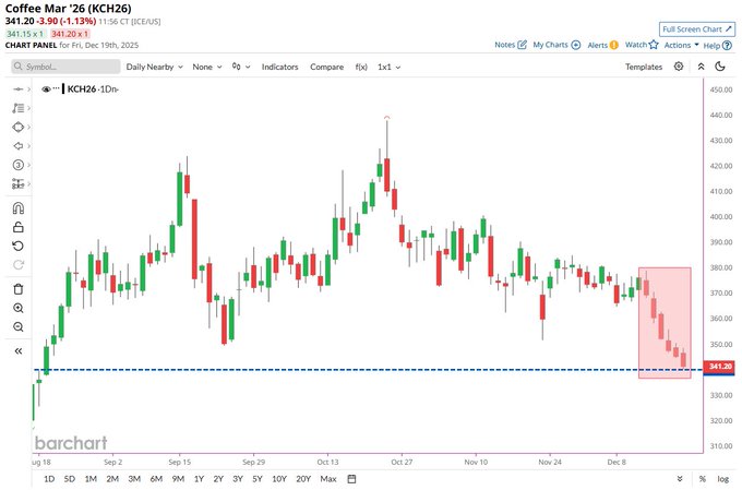 March arabica coffee (KCH26) today is down -7.20 (-2.00%), and January ICE robusta coffee (RMF26) is down -86 (-2.13%).
