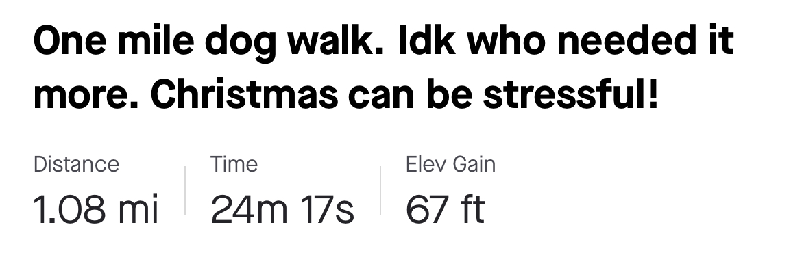 One mile dog walk. Idk who needed it more. Christmas can be stressful!