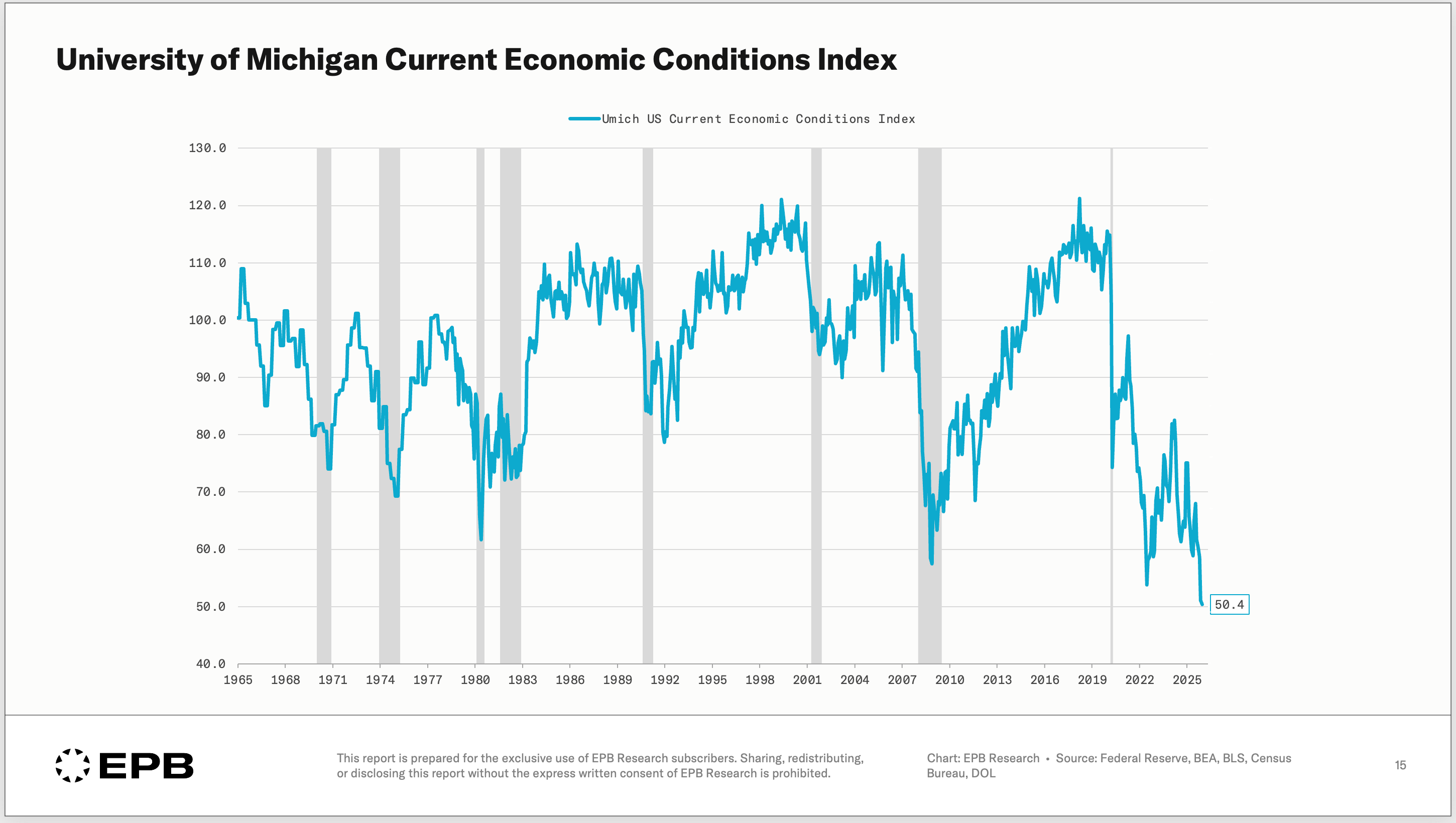 What makes this moment different is that the drop hasn’t come from a single shock. It’s been a slow erosion. Prices reset higher, borrowing got more expensive, and even as inflation cooled, the level of costs stayed elevated. That’s why sentiment hasn’t bounced the way it usually does when inflation rolls over. People don’t feel relief just because prices rise more slowly, they feel it when their pay, savings, and purchasing power actually catch up. The consumer is already defensive. When current conditions sit this low, spending usually weakens next, not all at once, but gradually…first discretionary, then credit, then labor. At this point, it wouldn’t take a big jobs shock to turn this from frustration into something more tangible.