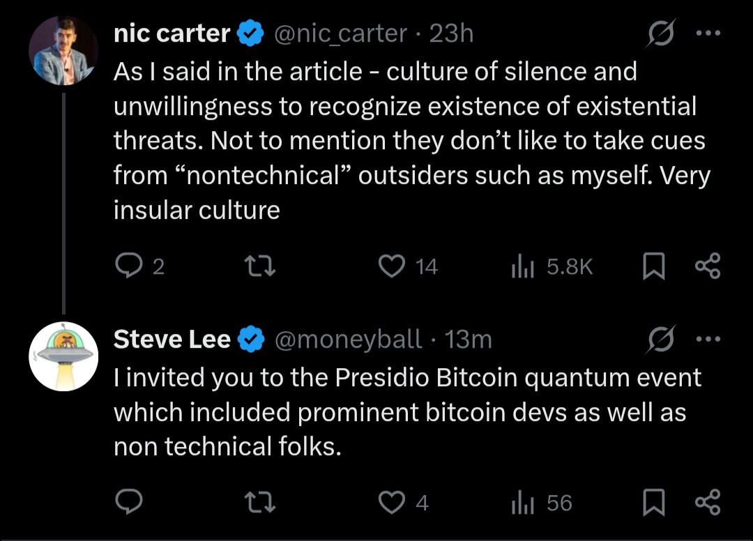 So he apparently thinks all the work being done on quantum is just sleepwalking? Then he gets grumpy at Back because Nic thinks "someone like myself has earned the right to be heard in Bitcoin"