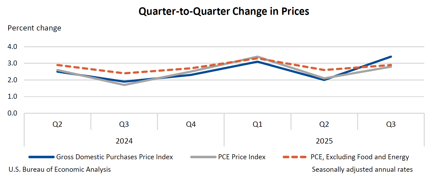 The price index for gross domestic purchases increased 3.4 percent in the third quarter, compared with an increase of 2.0 percent in the second quarter. The personal consumption expenditures (PCE) price index increased 2.8 percent, compared with an increase of 2.1 percent. Excluding food and energy prices, the PCE price index increased 2.9 percent, compared with an increase of 2.6 percent.