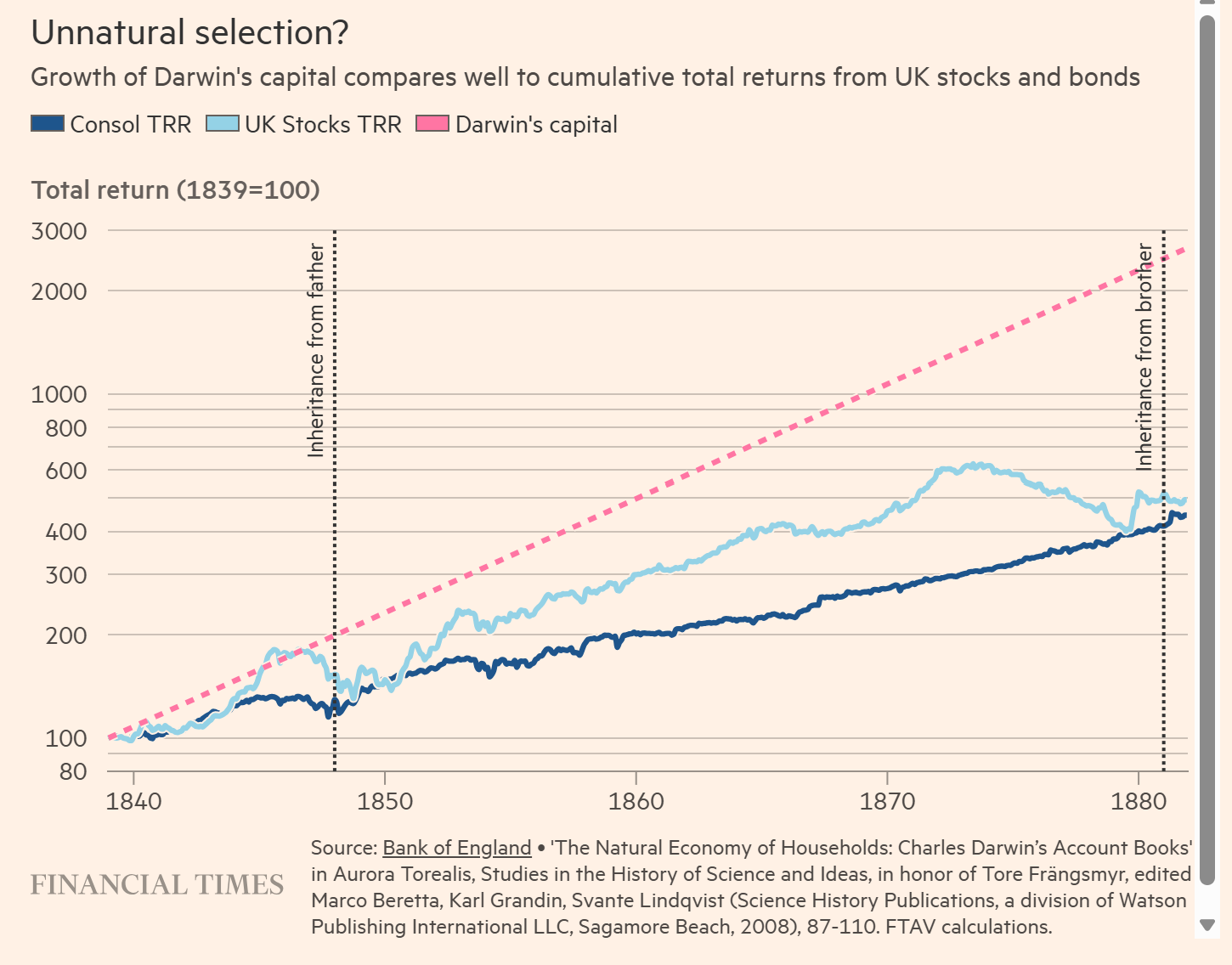 Professor Janet Browne picked through the numbers and found Darwin a careful and successful investor, writing mortgages on Shropshire property and riding the wave of railway companies, canals and dockyard schemes into the 1860s before wisely flipping his portfolio into consols in the mid-1860s (there was a massive crash in 1873).