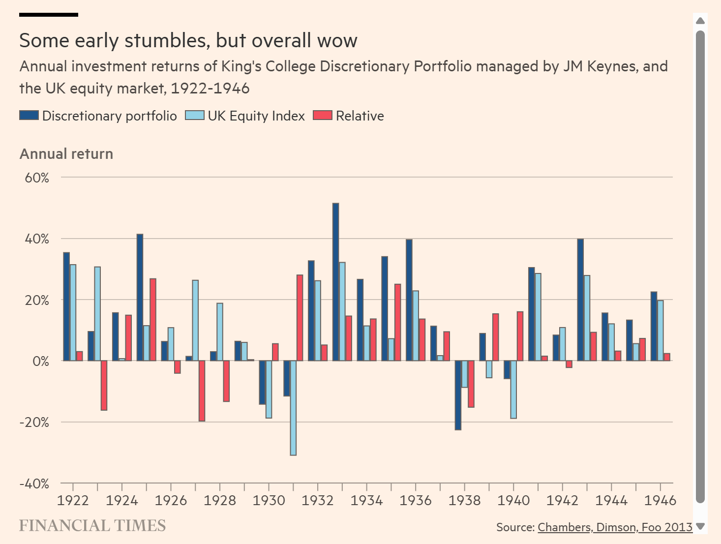 Mathematician, geopolitical strategist, economic adviser and general father of macroeconomics, Keynes had it all. Moreover, we don’t need to guess whether his true calling lay in HFT, macro-punting, fixed income arb, or long-short equities. Because from 1922 he managed the endowment for King’s College Cambridge, and the records have been meticulously pored over by a host of academics. Keynes took over a portfolio entirely invested in bonds and made the heretical move to trade this almost entirely into stocks — an asset class traditionally the territory of individual investors. The result was a portfolio that averaged over 15 per cent per annum investment returns for 25 years.