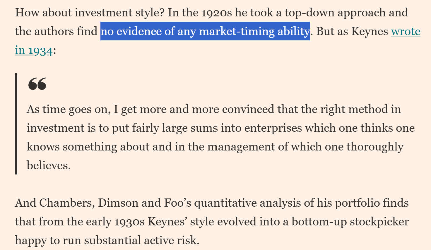 "Keynes outperformed UK stocks by 521 basis points a year, and suffered only six years of underperformance over the period"