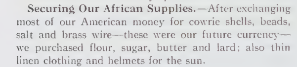 So, the missionary, headed to the Congo, purchased cowrie shells, beads, salt, and brass wire, to be able to use as currency there. I wouldn't have thought that salt would be valuable enough, considering it's bulk. Also cowrie shells were on there way out, but when this occurred (1890) I guess they were still used. It reminds me of the section on the history of money in The Bitcoin Standard, by Saifadean Ammous.