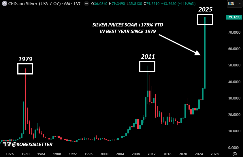 The commodity has risen an impressive +175% in 2025, on track to close eight consecutive months of gains—something unprecedented since 1980.