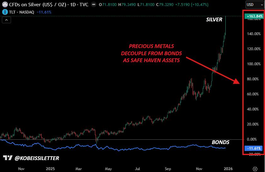 2025 marked the end of traditional correlation. While the S&P 500 had a good year (+17%), metals soared: Gold rose 4x more (+72%) and Silver 10x more (+174%).