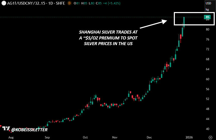 As a result, a total price disconnection. In Shanghai, silver trades at a premium of ~US$5/oz over the rest of the world. China intentionally pays more to "dry up" global supply.