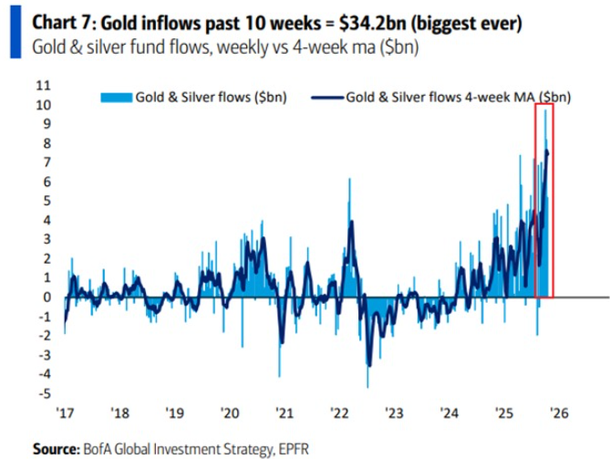 Gold and silver funds have seen net inflows of $34.2 billion in just the last 10 weeks — the largest flow ever recorded.