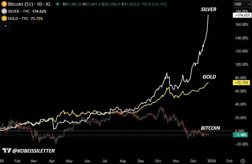 The thesis that Bitcoin would replace gold failed in 2025. While silver rose 174%, Bitcoin fell -5.5%.