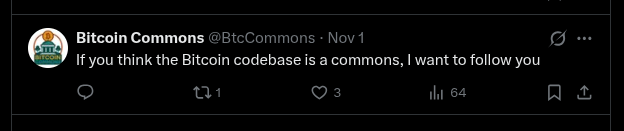 On 1 November 2025, a brand new X account calling itself Bitcoin Commons (@BtcCommons) posted this: