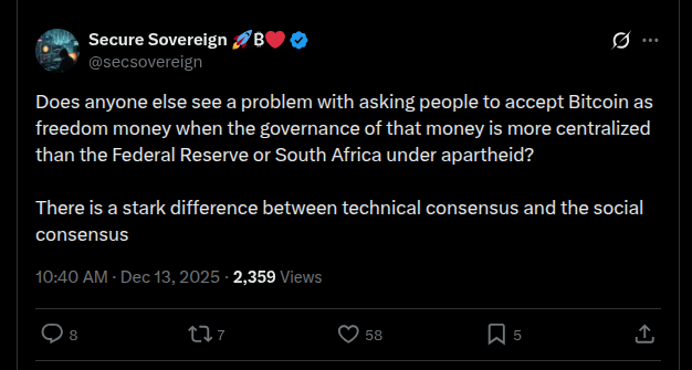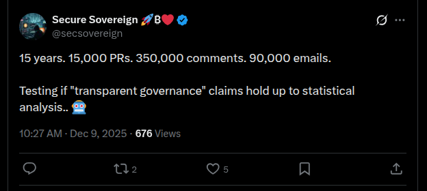 This secsovereign account was familiar to me because I had recently seen it posting a lot about power concentration in Bitcoin development. I'm sympathetic to such things, but the more I read what this account produced, the less I had patience for: if you're going to rely on AI to produce complicated analysis, you should probably do a lot more double-checking before releasing sensational claims.