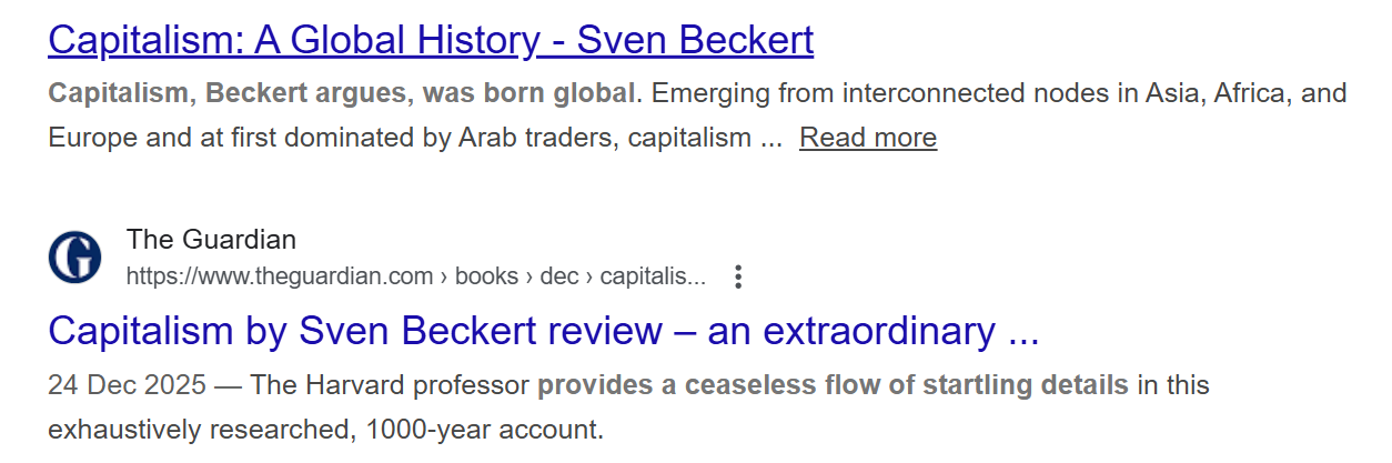 Sven Beckert was all the rage with his Empire of Cotton back when I was at uni (summary: slavery made capitalism and the modern world, and only the American South-type of slavery for which cotton was crucial) -- he even gave a lecture for us at Oxford.