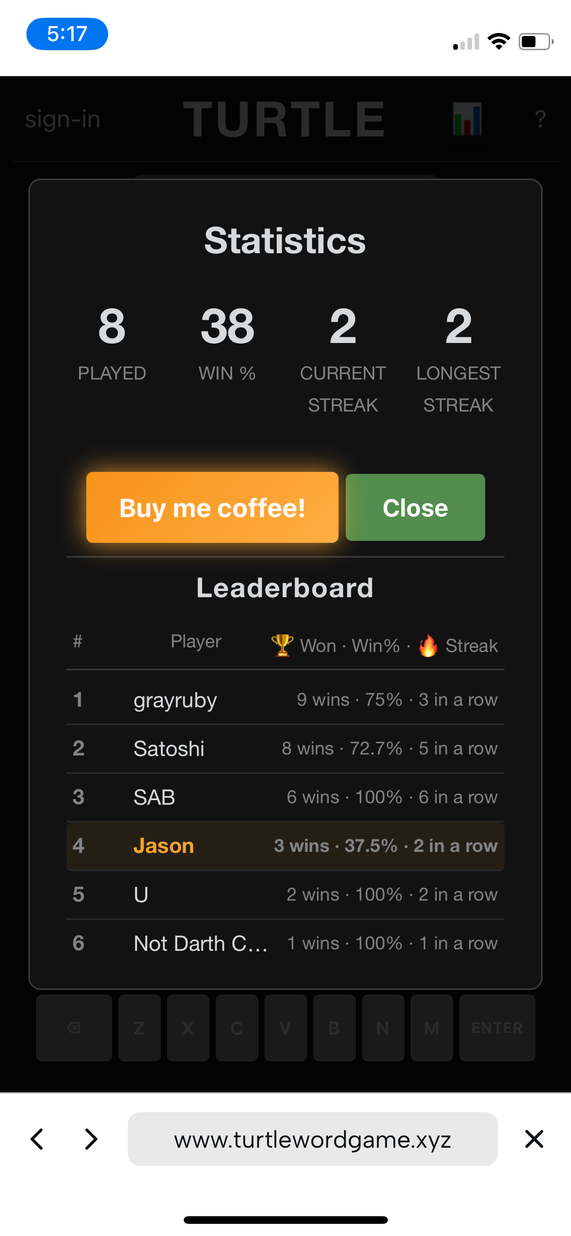 Now, here's the fun or aggravating part depending on your perspective. I didn't include a password. Sooooo, you can go in and mess up other people's stats. Buuuut, you only get one free game a day (per browser I suppose), so it costs you to be slanderous. But it's also kind of interesting if you want to be on, for example, team Dave. You could approach the whole leaderboard from the perspective of just getting the global Dave score up.