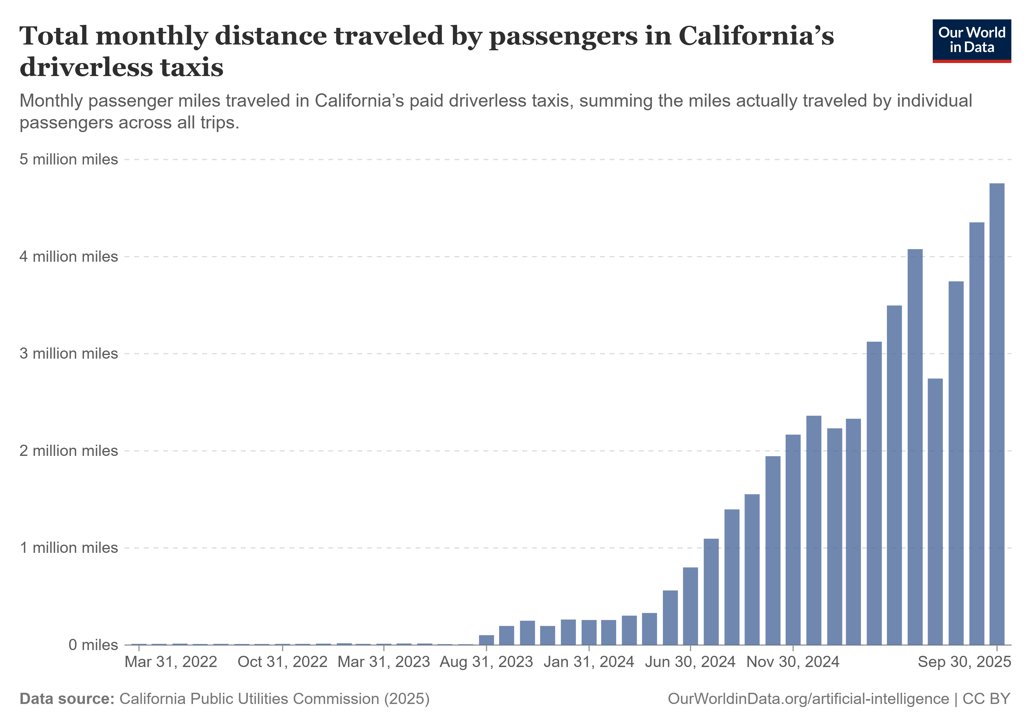 Total monthly distance traveled by passengers in California’s driverless taxis