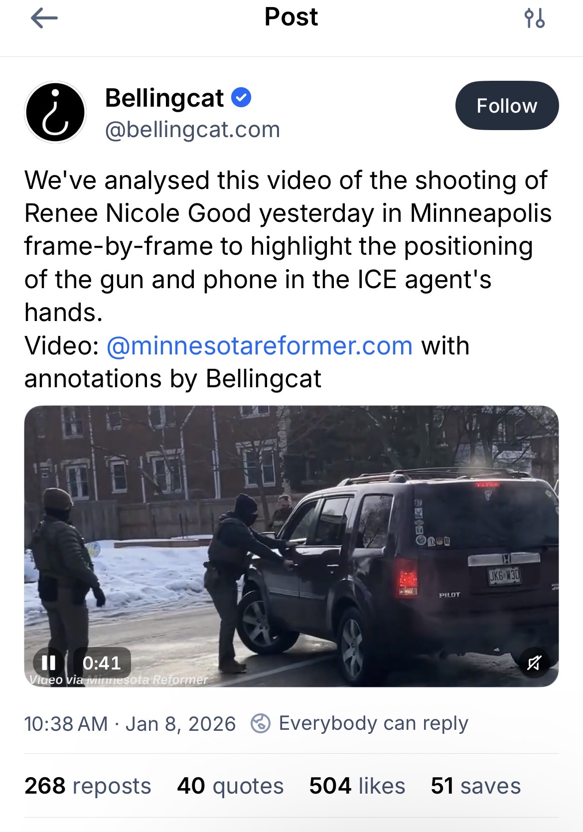 If “self-defense” is the claim, the standard is necessity + proportionality. Watch the hands: Bellingcat’s frame-by-frame suggests the shooter keeps a phone in his left hand through the approach/draw/shots, and the camera app appears visible shortly after. That’s a real, testable detail.